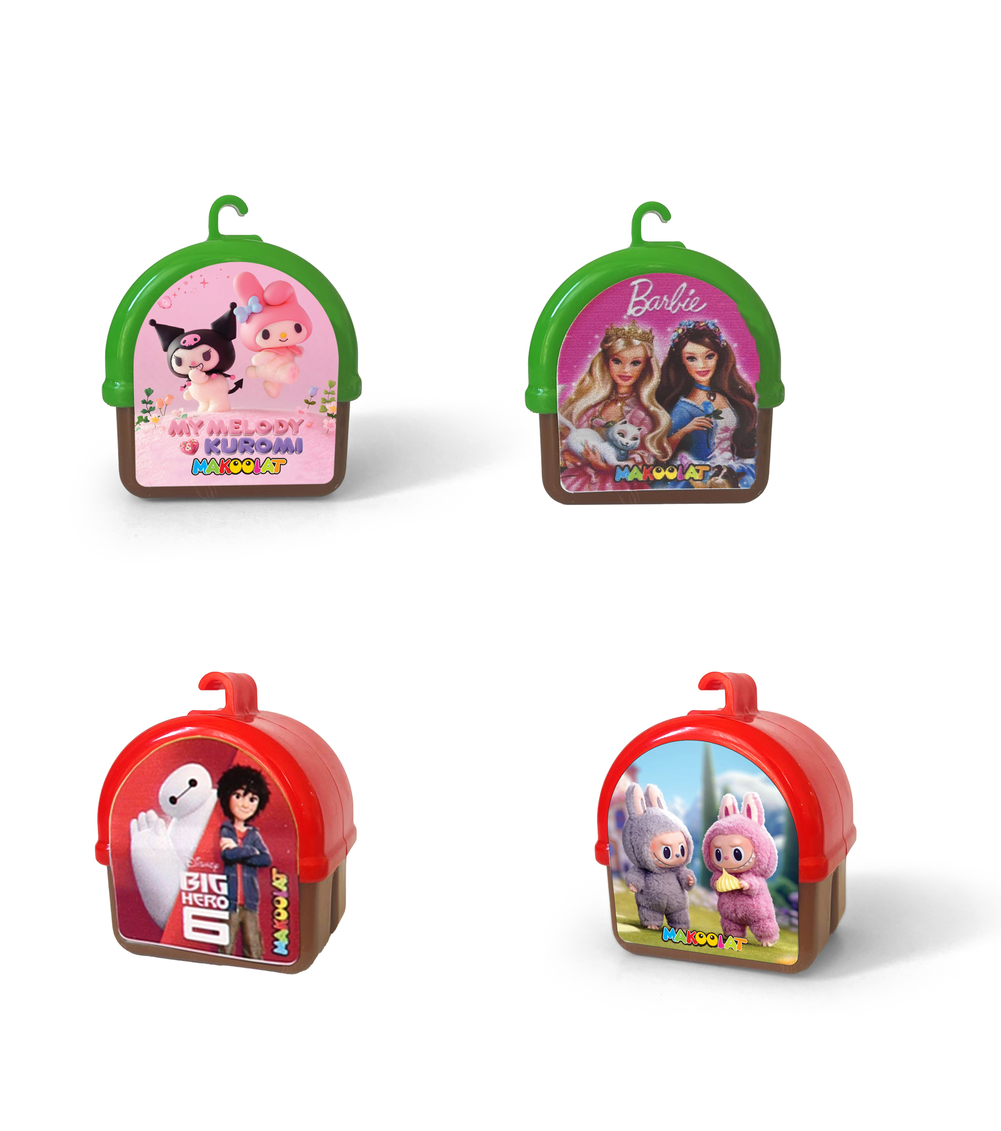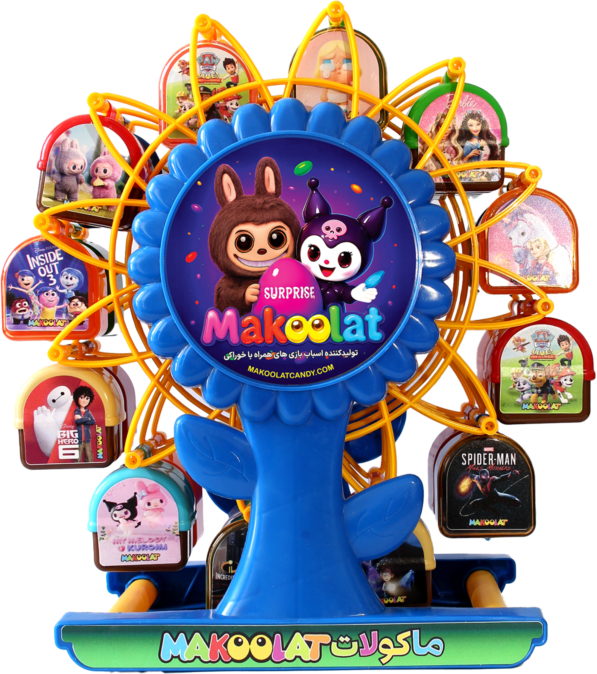- نوع محصول: شانسی چرخ و فلک ماکولات متشکل از 24 عدد کابین است و هر کابین آن به عنوان یک باکس هدیه استفاده می گردد و روی هر کابین این سورپرایز چرخ و فلکی تصویری از شخصیت های بروز و ترند انیمیشن می باشد.